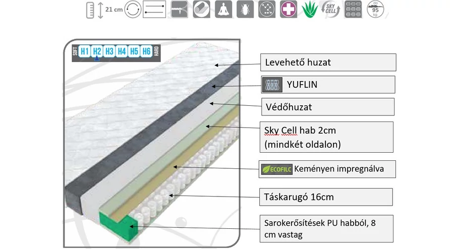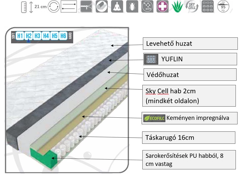 A Sky Fresh egy közepes keménységű, táskarugós matrac, melynek fokozott komfortérzetét egy plusz réteg habozat biztosítja.